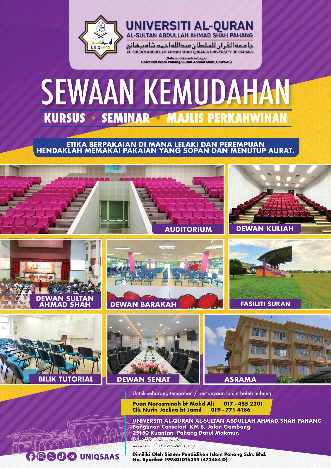 Universiti Al-Quran Al-Sultan Abdullah Ahmad Shah Pahang (UNIQSAAS) mempunyai penyelesaian terbaik untuk anda. Ruang untuk seminar, latihan, perkahwinan, makan malam, re-union dan juga perlbagai kemudahan seukan serta penginapan teleh tersedia untuk anda.
